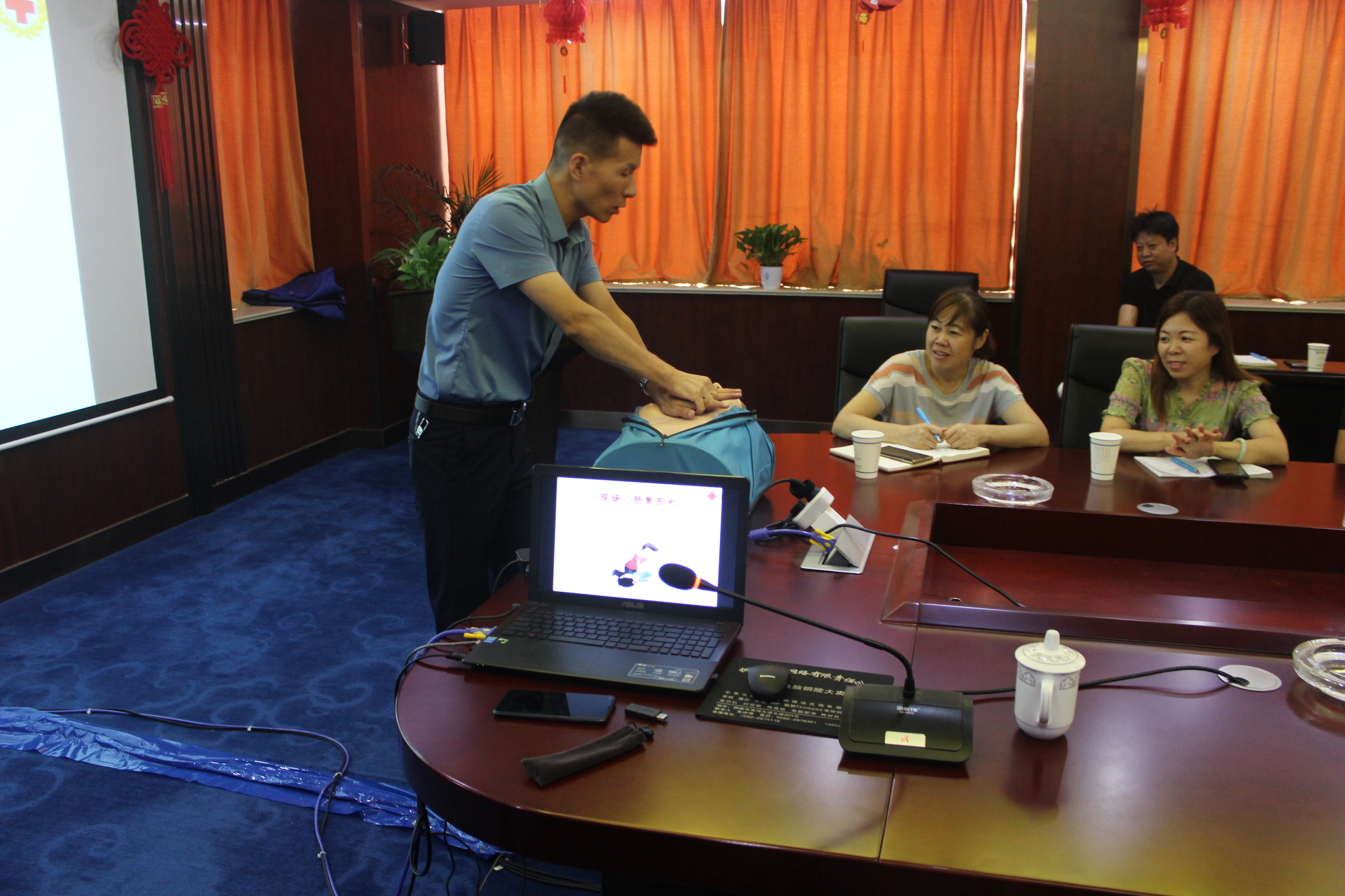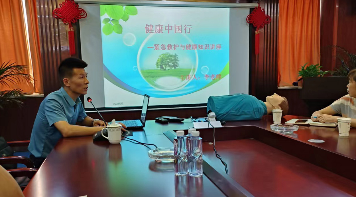 講座現場,授課老師用通俗易懂、幽默風趣的語言,采取理論知識講授,特別是突發意外事件的現場處理,包括人工呼吸、心肺復蘇、止血包扎等急救常識進行現場演示以及實踐操作,讓員工們充分認識到了應急救護黃金時間的重要性。講座中老師還就如何形成健康的生活方式,現代職業病的預防及改善、三高慢性疾病流行疾病預防治療、心理健康及中醫常見穴位養生知識等內容對職工進行了詳細而系統的介紹和講解。同時希望職工們在日常身體保健中確保合理膳食、適量運動、戒煙限酒、心理平衡和定期體檢。