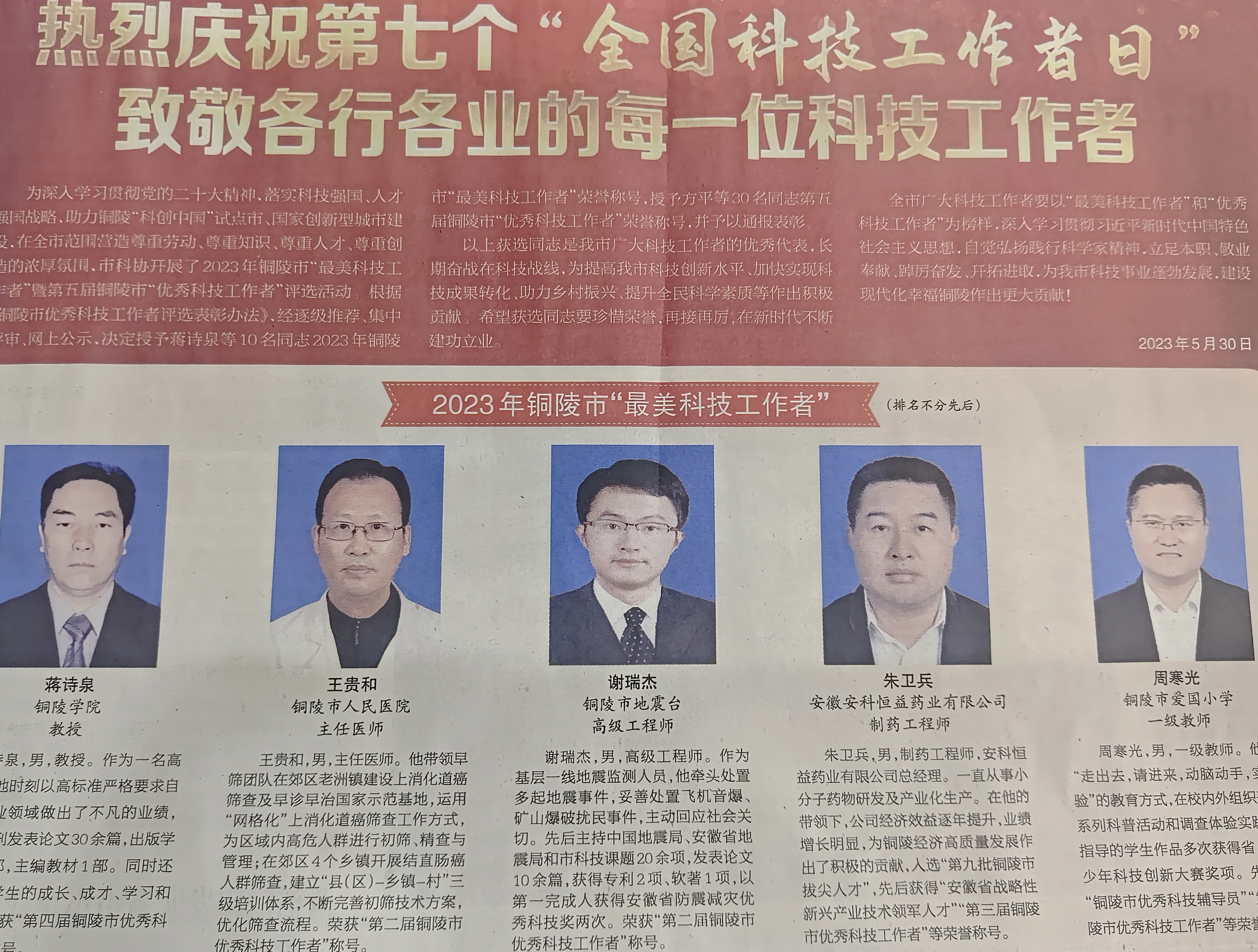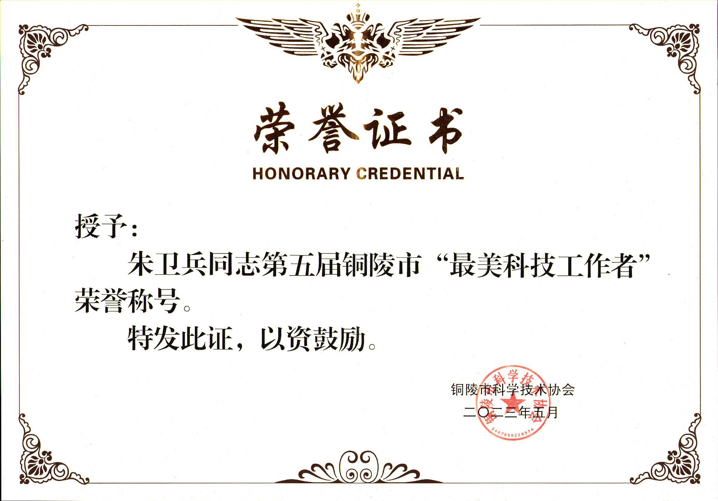 總經理朱衛兵先生獲2023年度銅陵市“最美科技工作者”榮譽稱號